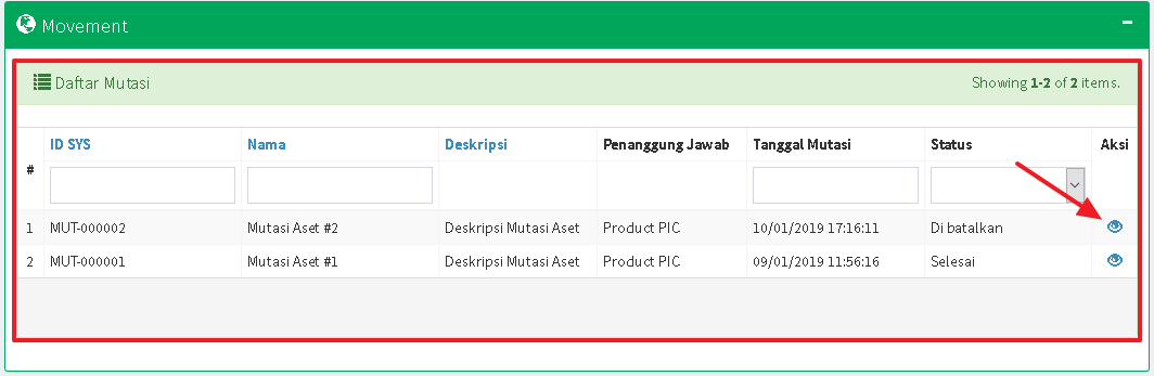 Aset yang berhasil ditambahkan dapat dilihat pada Daftar Mutasi Aset