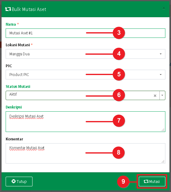 - Jika Anda hendak mutasi aset dengan lokasi, status aset dan penanggung jawab tujuan yang berbeda, harap buat dokumen mutasi baru.