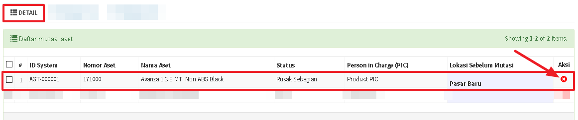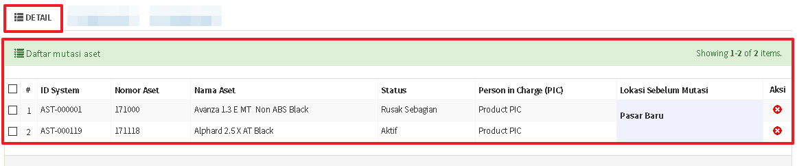 Kolom detail daftar aset memberikan informasi daftar aset yang hendak dimutasi. Anda dapat menghapus dan menambahkan aset dari dan ke daftar aset.