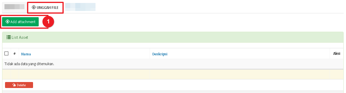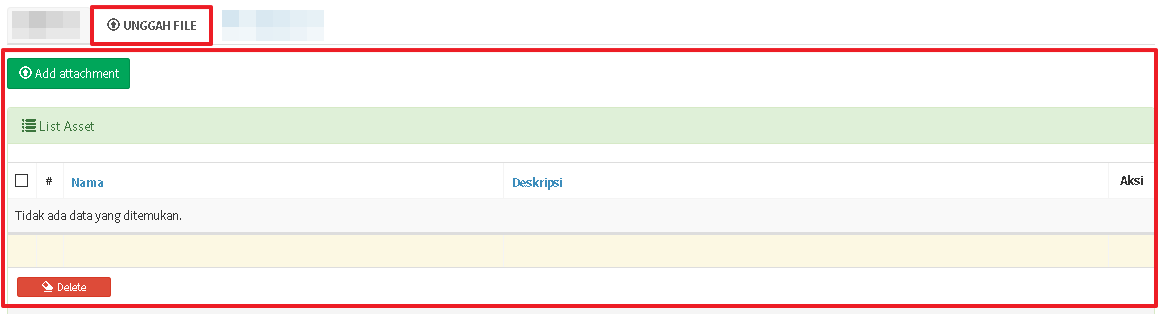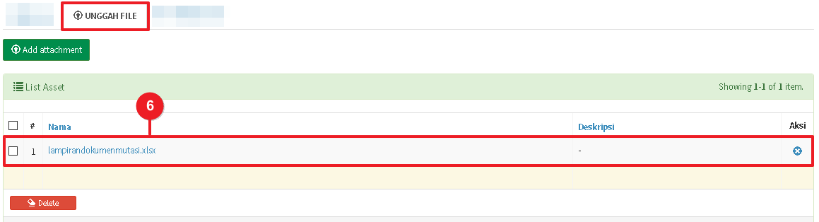 Klik Unggah untuk mengunggah berkas lampiran - Jika file lampiran berhasil diunggah, file lampiran akan ditampilkan pada Daftar Lampiran. Anda dapat menghapus file lampiran yang telah diunggah dengan klik tombol Hapus di kolom Aksi.