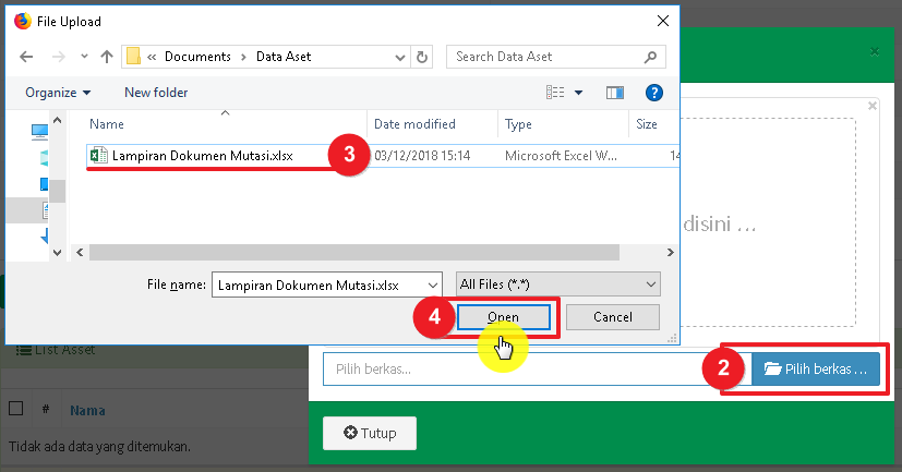 Berikut langkah-langkah menambahkan aset ke dokumen mutasi: