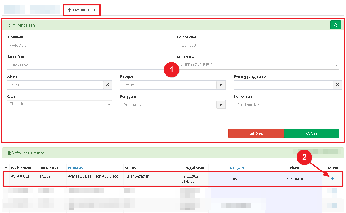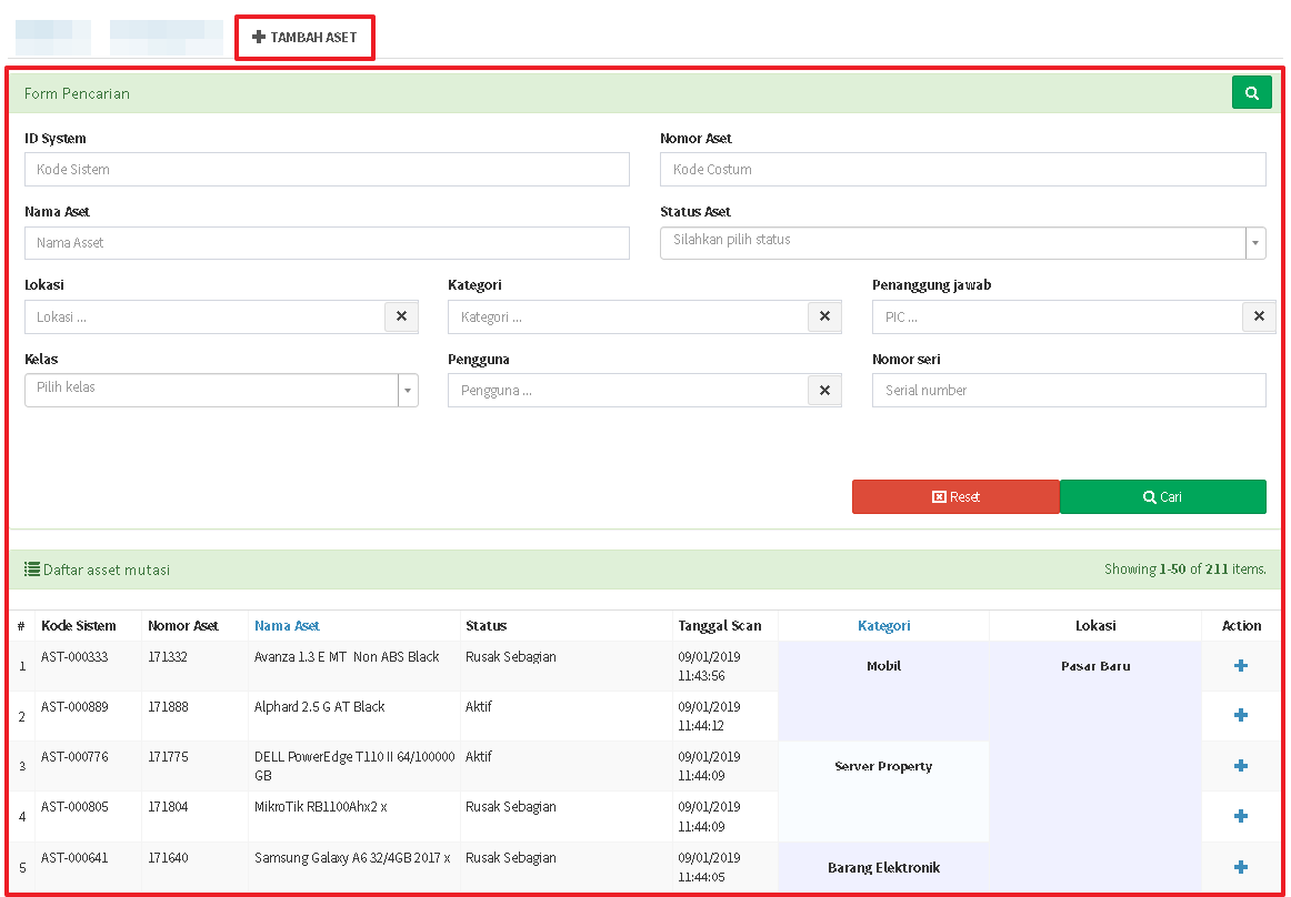 - Pilih tab TAMBAH ASET. Anda dapat pergunakan Form Pencarian untuk mencari aset yang hendak dimasukkan ke dokumen mutasi.