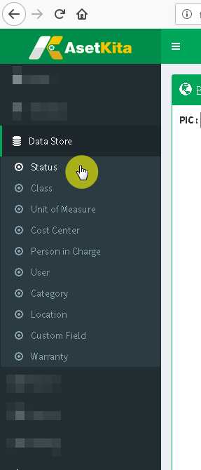 Untuk mengakses halaman Status Aset, silahkan pilih menu Status yang terdapat dalam grup menu Data Store.