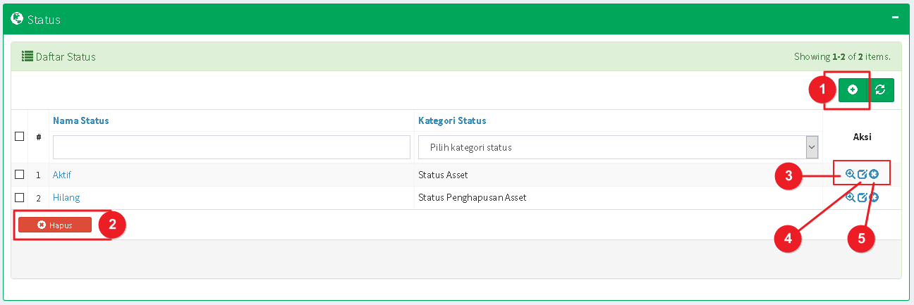 Status Aset terbagi menjadi dua berdasarkan status keberadaan Aset, yaitu; Status Normal dan Status Penghapusan (Disposal). Anda dapat menambahkan Status Aset berdasarkan kebutuhan, baik untuk Status Normal atau Status Penghapusan. Secara default, juga telah disediakan status Aktif untuk Status Normal dan status Hilang untuk Status Penghapusan.